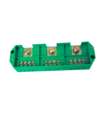 材料采用聚碳酸酯阻燃, 导电构件采用条铜块分线孔双螺钉压接技术,保证连接导线可靠,额定交流电压500V,分户连接截面 4~10mm2 ,总线截面10~50mm2 ,适用于住宅使用的电表箱分线连接,也适用小型单相计量的经营生产场所的开关板的表箱连接。